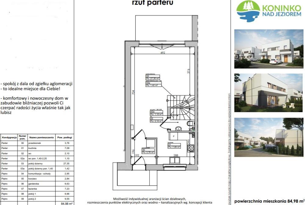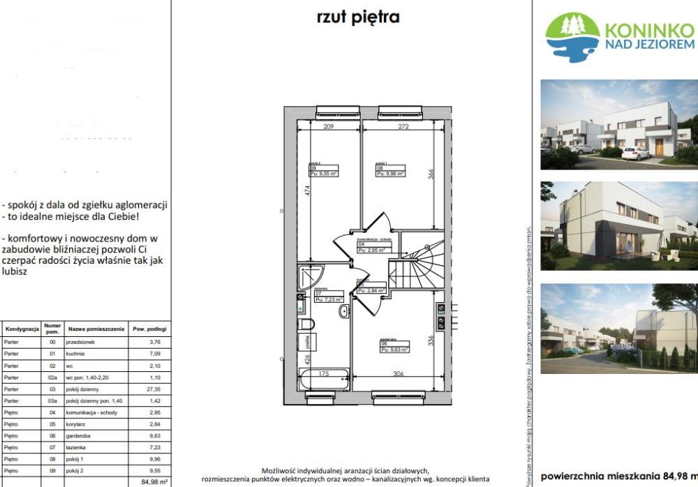 | Dom bliźniak Koninko, ul. Radiowa – komfort blisko Poznania! RYNEK PIERWOTNY BRAK PODATKU PCC!!! PROWIZJĘ DLA BIURA POKRYWA STRONA SPRZEDAJĄCA!!! Szukasz domu w spokojnej okolicy, ale z szybkim dojazdem do Poznania? Mamy dla Ciebie idealną propozycję! Prezentujemy nowoczesne domy w zabudowie bliźniaczej zlokalizowane w Koninku przy ul. Radiowej – miejscu, które łączy wygodę życia pod miastem z bliskością wszystkich udogodnień. Opis nieruchomości: Domy dostępne są w stanie deweloperskim, co pozwala na wykończenie wnętrza według własnego projektu i gustu. Możesz sam zdecydować o kolorystyce, materiałach i aranżacji przestrzeni. Ogrzewanie podłogowe w całym lokalu. Taras wykończony kostką brukową, ogrodzenie z siatki ocynkowanej. Wnętrze zostało zaplanowane z myślą o funkcjonalności i komforcie: • przestronny salon połączony z jadalnią i kuchnią tworzy otwartą, jasną strefę dzienną, • wygodne sypialnie gwarantują prywatność i komfort wypoczynku, • przemyślany układ pomieszczeń ułatwia codzienne życie i sprzyja relaksowi. Zestawienie pomieszczeń : Parter: • Przedsionek- 3,76 m² • Kuchnia- 7,09 m² • WC - 2,10 m² • Pokój dzienny- 27,35 m² • Pokój dzienny- (poniżej 1,40 m) 1,42 m² • Komunikacja / schody- 2,87 m² Piętro: • Korytarz - 2,84 m² • Garderoba - 6,63 m² • Łazienka - 7,23 m² • Pokój 1 - 9,65 m² • Pokój 2 - 9,55 m² Łączna powierzchnia użytkowa: 84,98 m² Cena: 589.000 zł Atuty lokalizacji: • tylko kilka minut do Poznania, • w pobliżu sklepy, szkoły, przedszkola i komunikacja miejska, • spokojna, zielona okolica z dostępem do terenów rekreacyjnych. To idealne miejsce dla osób, które chcą cieszyć się ciszą przedmieść, mając jednocześnie wszystko, czego potrzeba do wygodnego życia – tuż obok miasta. Zapraszamy do kontaktu i umówienia prezentacji! Katarzyna Różańska 503 099 938 |